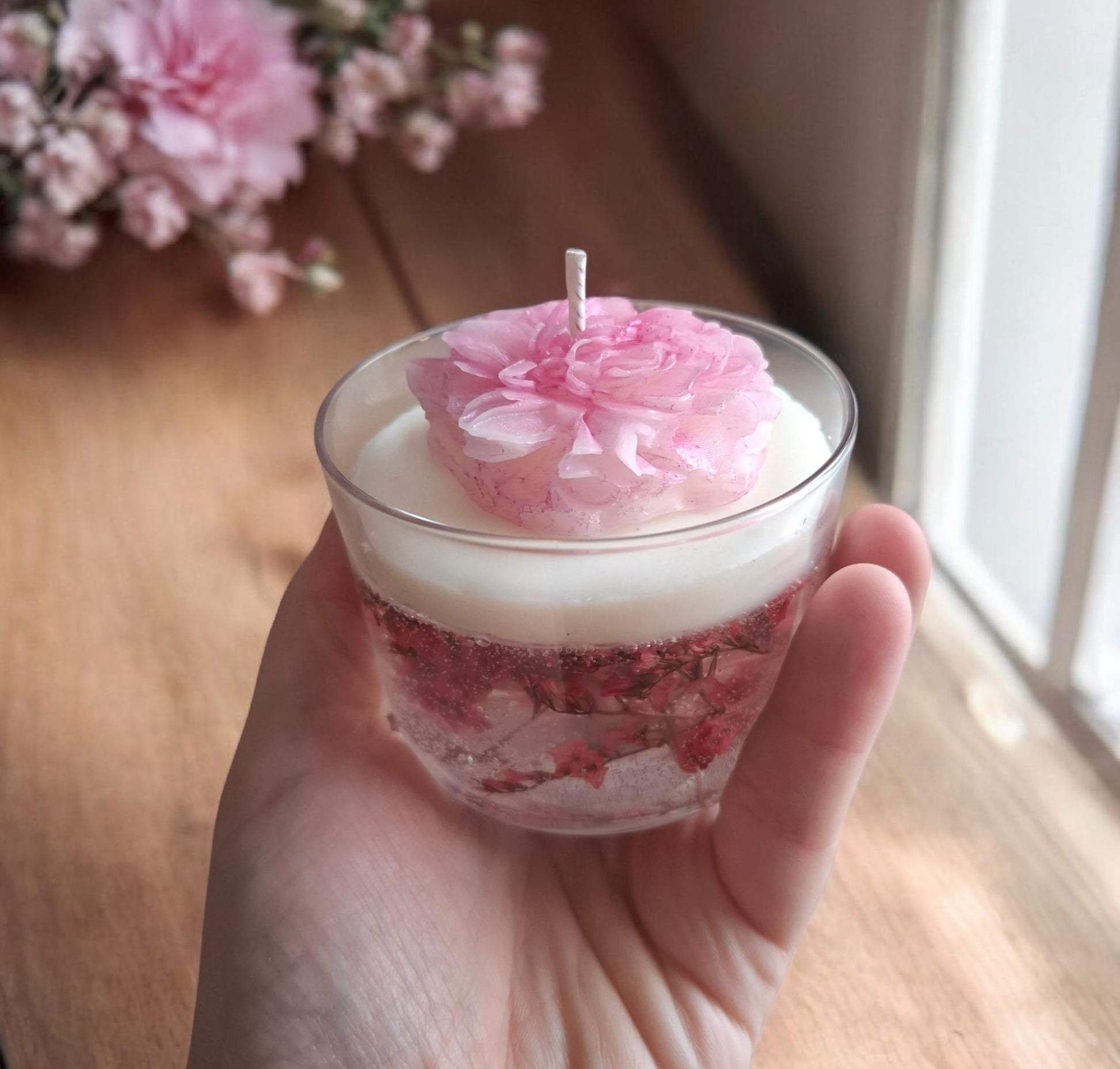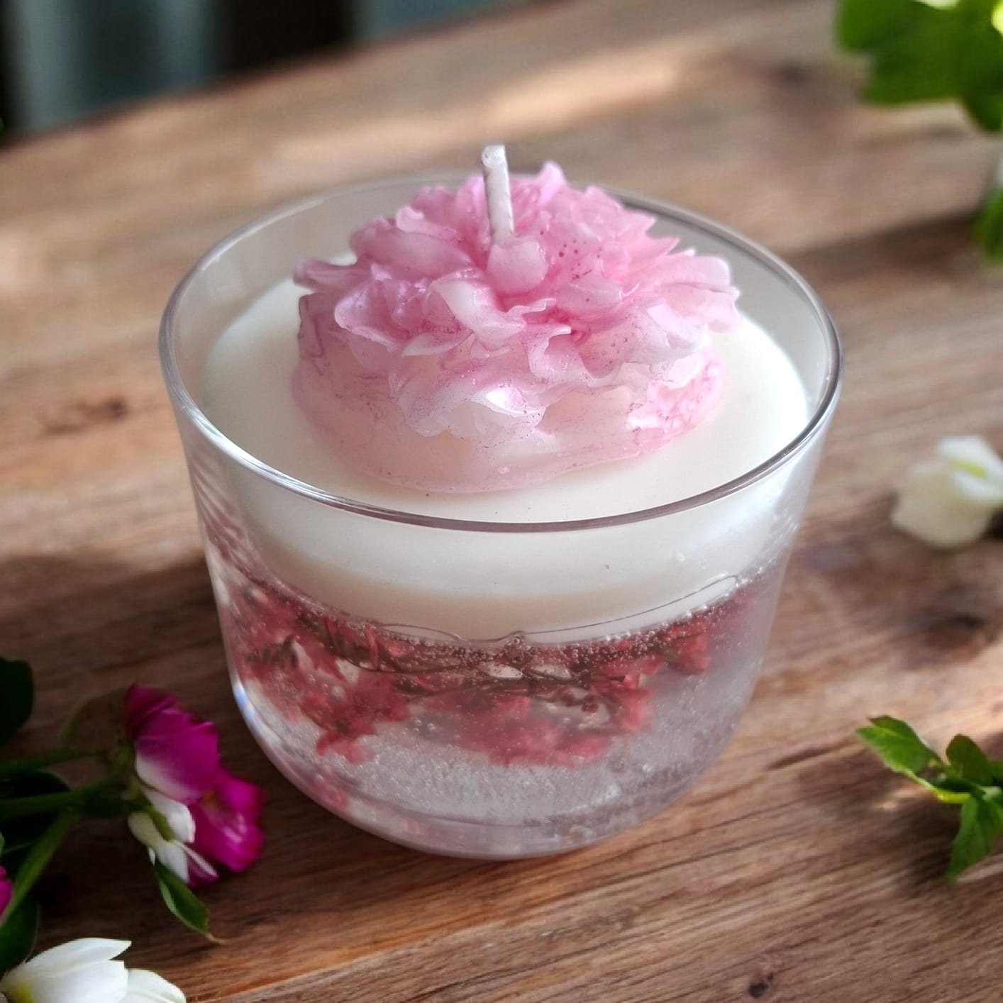 La bougie artisanale « Pivoine des Champs » est réalisée entièrement à la main en gel de paraffine ultra transparent. Des fleurs séchées naturelles sont suspendues dans le gel, créant un effet champêtre et poétique.